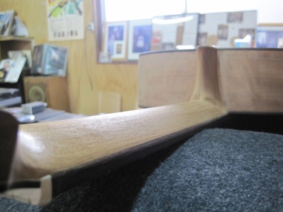 弾きやすさも音も、ウサギのかかとからアキレス腱の筋がつながってるような形の方が絶対に良いと思うんだけどなぁ・・・。自分でも削らせてもらってよくわかったけど、丸形は強度重視のネックで弾きやすさと音は二の次のような気がしました。
