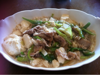 長ネギ、ピーマン、豆腐、豚肉で塩炒めです。