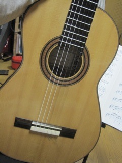 僕が望んだ三角形のネックに出来上がったということで、試奏しに行ってきました。これ、完璧です!セーハなんかスゴく楽チンです!通常の丸いネックの出っ張りで親指の腹を押される疲労感も全くないし、斜めに平面だから親指の位置に準じて肘や腕が前に出るから低音弦側がとても押えやすいです。ネック幅50.1mm、弦幅42.6mmも僕にジャストフィットのインスピレーション通り!それから注目するべき点は指板のところまで斜面と同じ角度で削り込まれてることです。これは19世紀ギターの弾きやすさに準じています。田邊くんの素晴らしいアイデアです!そういえば、昔はほとんど全部、三角形のネックだったのに、いつから丸形になったんだろう???